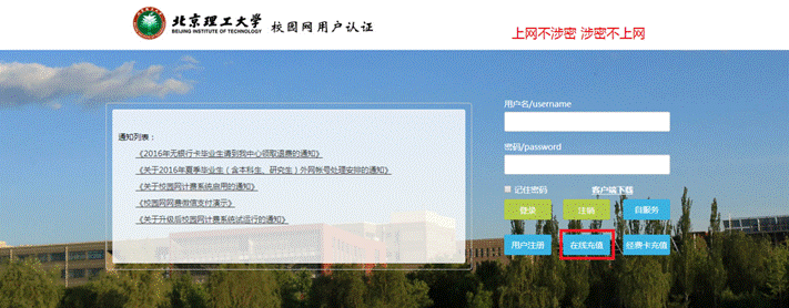 选择“网络交费”选项将进入用户账号缴费界面,选择“重置网络密码”和“重置邮件密码”选项将进入用户账号和电子邮箱密码重置界面,选择“返回”选项将返回上一级菜单。