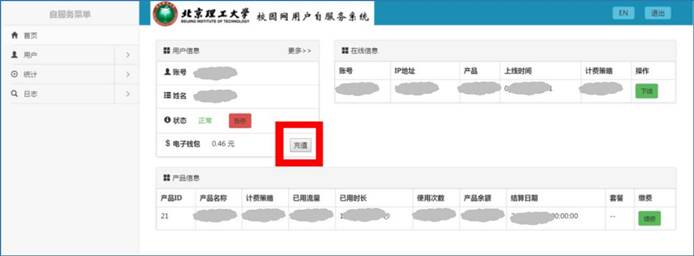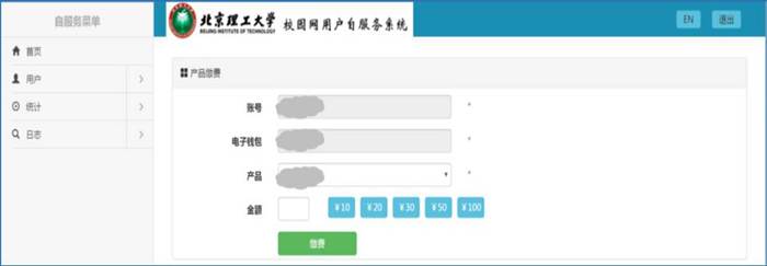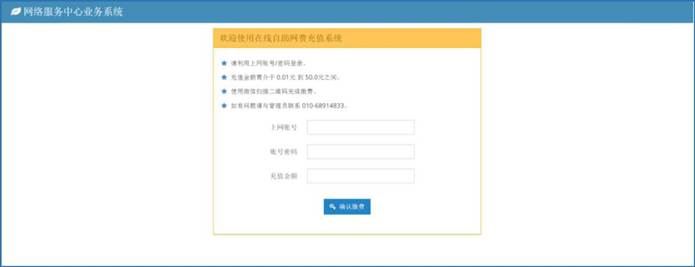 选择“网络交费”选项将进入用户账号充值界面,选择“重置网络密码”和“重置邮箱密码”选项将进入用户账号和电子邮箱密码重置界面,选择“返回”选项将返回上一级菜单。
