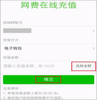 3.进入登录页面,输入校园网账号、账号密码以及缴费金额,填写完毕后,点击“确认缴费”。