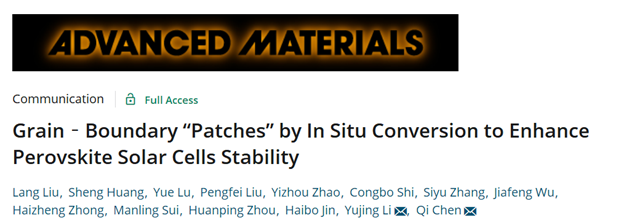 近日,28365-365陈棋教授和李煜璟教授在材料类顶级期刊Adv. Mater.上发表了题为《Grain Boundary “Patches” by in situ Conversion to Enhance Perovskite Solar Cells Stability》的文章。该工作利用有机小分子甲巯咪唑(MMI)处理钙钛矿薄膜,将钙钛矿薄膜表面残存的PbI2原位地转化成PbI2-MMI络合物。该工作的巧妙之处在于形成的PbI2-MMI络合物刚好位于晶界处,好似“补丁”一样,将毗邻的晶粒缝合在一起!值得一提的是:MMI是治疗甲亢的特效药物。钙钛矿薄膜经过MMI“treatment”之后,其光稳定性显著增强了。此外,研究人员还发现该晶界补丁能够抑制离子迁移和金属电极扩散,极大地提升器件稳定性。未封装的器件经过670多个小时的持续光照之后还维持了80%的初始效率。该工作通过引入晶界补丁的形式系统性地提高了器件的稳定性,为解决稳定性提供了全新的思路。