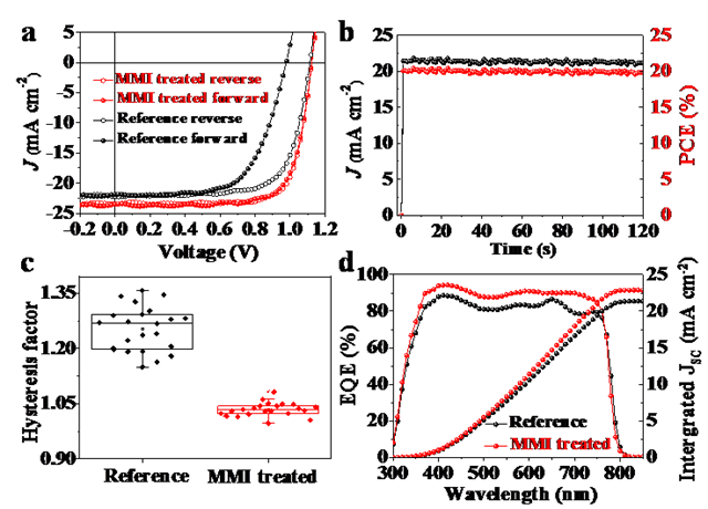 图2 器件光电性能。a. 器件J-V曲线;b. 稳态效率;c. 迟滞系数;d. EQE曲线和积分电流曲线。