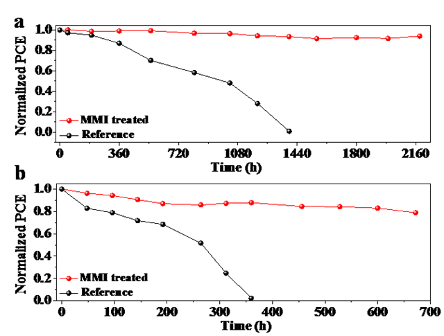 该研究利用有机配位小分子和残存的PbI2构建了PbI2-MMI络合物“补丁”。同时提高了薄膜和电极的稳定性,显著延长了钙钛矿太阳能电池寿命。而且该方法简便易行,具有普适性也能够应用到其他领域,为材料设计提供了新的策略。