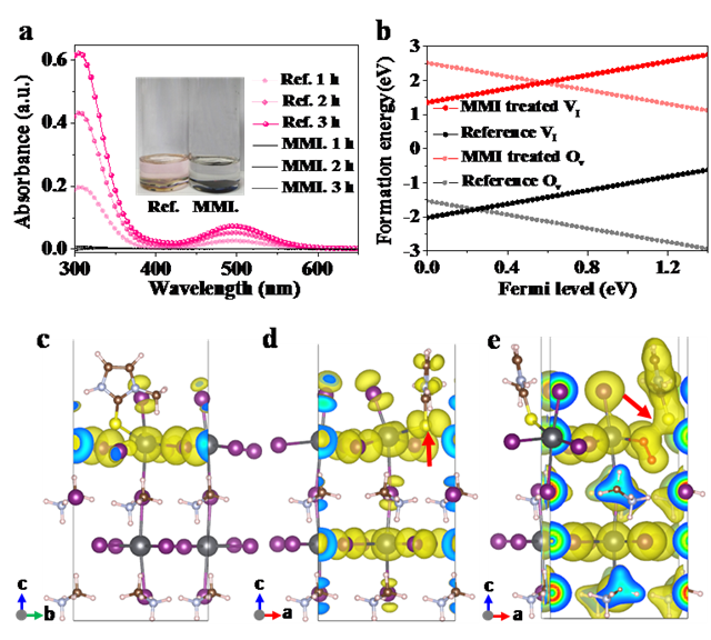 图4 薄膜稳定性及进一步计算验证。a. MMI处理和未处理的薄膜样品不同光照下的吸收曲线;b. 缺陷形成能计算; c. MMI和无缺陷钙钛矿作用模型;d. 碘缺陷存在下MMI作用模型;e. MMI和氧缺陷作用模型。