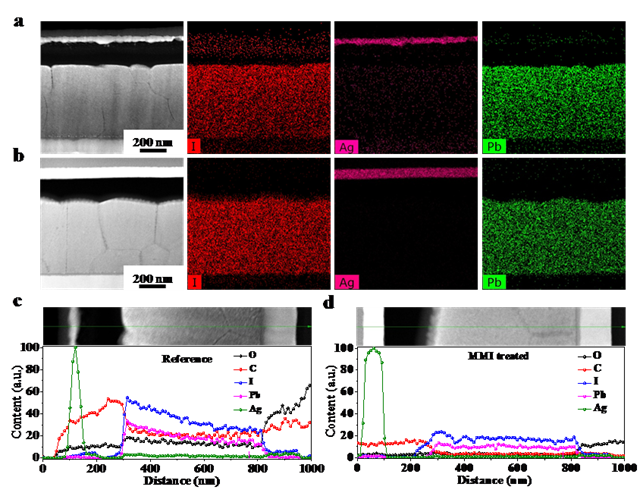 图5 器件稳定性:抑制碘迁移和银电极扩散。a. 未经MMI处理的HAADF-STEM图;b. MMI处理之后的HAADF-STEM图;c. 未经MMI处理的器件EDX线扫图;d. 经MMI处理的器件EDX线扫图。